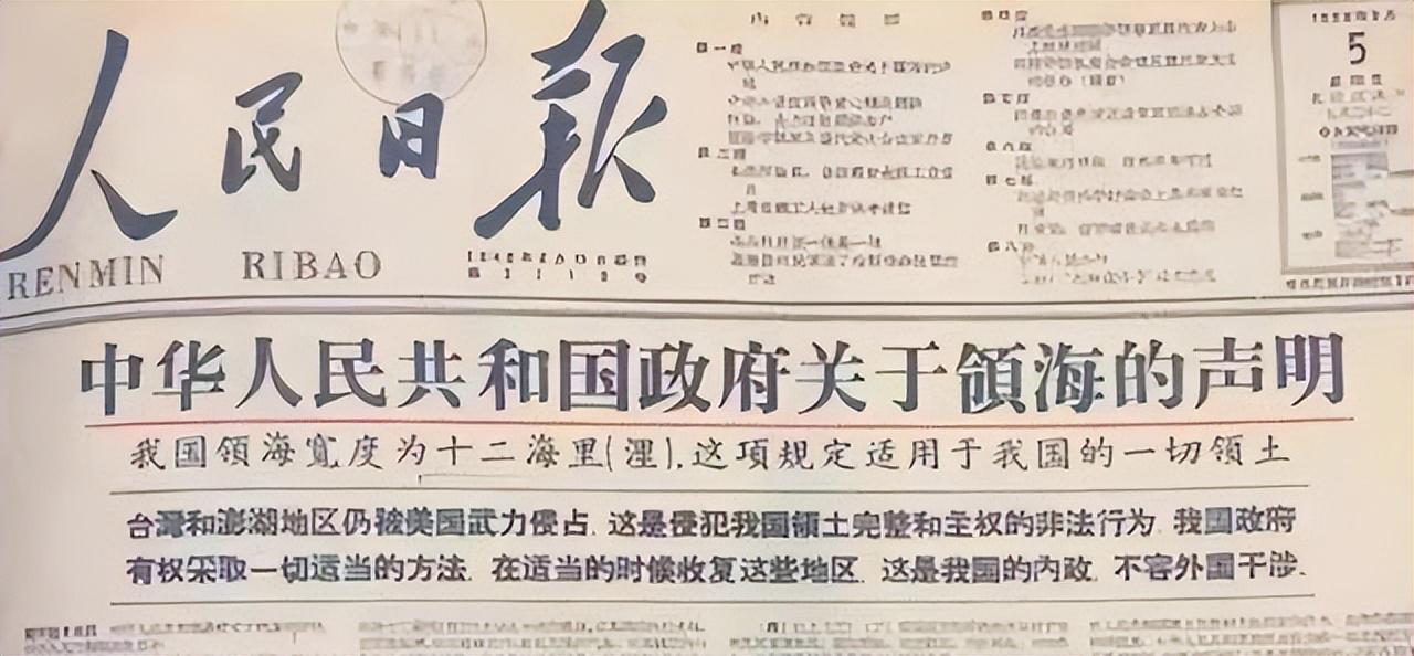 1958年9月4日,新华社向全世界广播了《中华人民共和国政府关于领海的声明》,郑重宣布:中国的领海宽度为12海里。